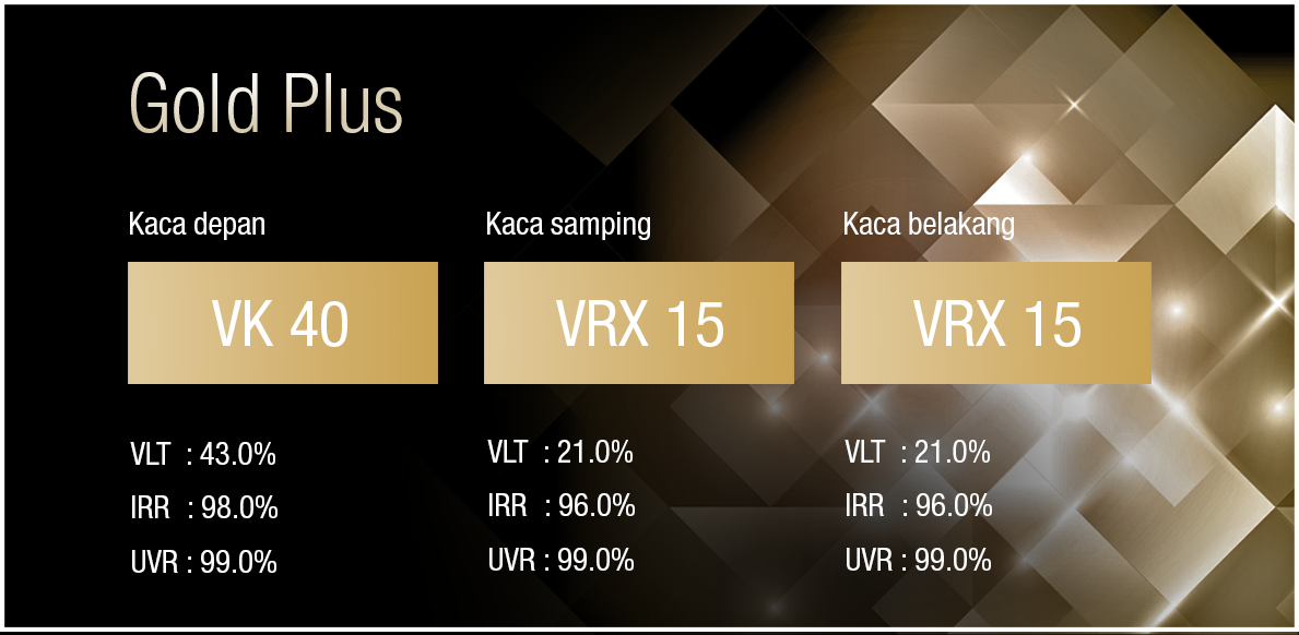Nyatakan diri Anda dengan rangkaian V-KOOL Gold Series. Kaca film berkinerja tinggi ini menjaga interior mobil Anda tetap dingin dengan menolak gelombang merah infra merah serta memberi Anda kenyamanan dalam kemewahan.